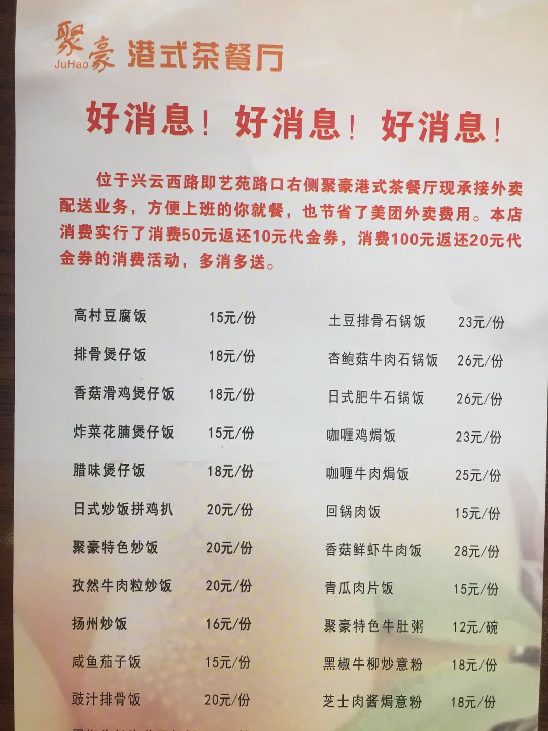 位于马岗新村路口对面的聚豪港式茶餐厅,推出优惠活动消费满50元以上送10元 ...