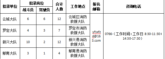 2、报名方式:报名采用线下或线上报名的方式。线下:应聘者本人将报名表报送至云浮市消防救援支队人事训练科办公室(地址:云浮市云城区环市中路188号四楼人事训练科办公室);线上:应聘者本人将报名表发送至邮箱(yfsxfzd@163.com),文档名和邮件标题请注明“XX(姓名)+报名岗位”字样。